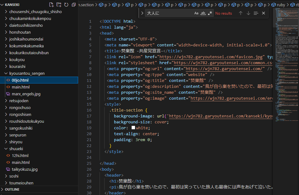 これがメモ帳。なんというかイメージ的には紙テープを目で読むような感覚に近い。ケロQの『モエかん』でそんなのあったね。(アレはアンドロイドが目視するんだけども。)で、今回VisualStudioCodeを導入したきっかけはcommon.cssという、要は複数ページ共通の形式を共有するためのシートを導入するにあたって全ページを書き換えることになり、もうメモ帳では無駄が多すぎると感じたからです。仕事もしているのに時間があんまりもう時間をかけたくない。時短のための導入である。で、おまちかねのVisualStudioCodeがこちら。